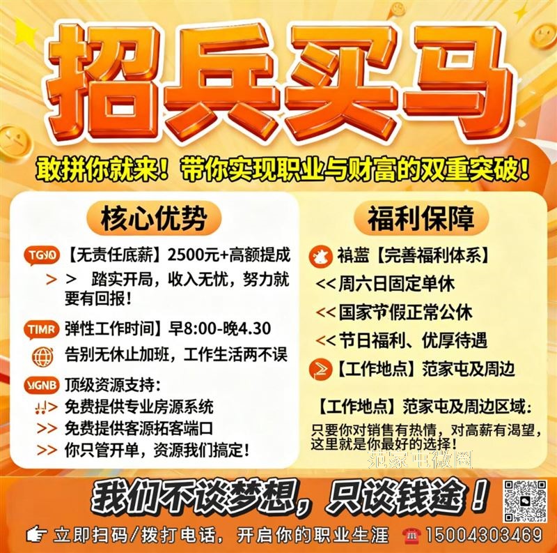 招聘房产经纪人,无责任底薪2500➕提成,早八晚四点半,有经验者优先,免费提供房源系统及拓客端口!工作地点范家屯! 周六周日单休 节假日公休 节日福利待遇优厚 有想干地产行业的随时联系我 15004303469